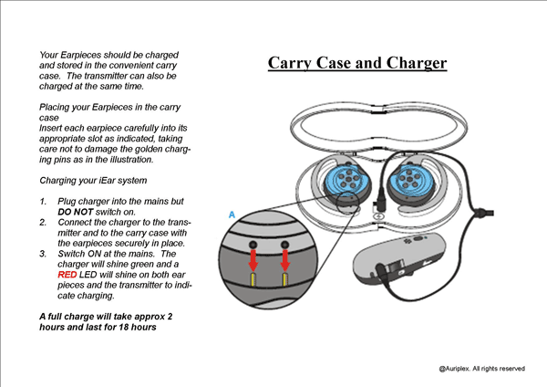 Take your iEar with you with the stylish carry case and enjoy the sounds of daily living! The carry case will also double up as a charging dock for the earpieces.